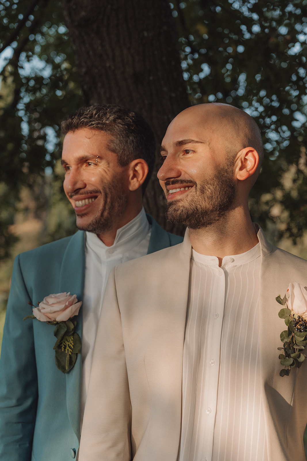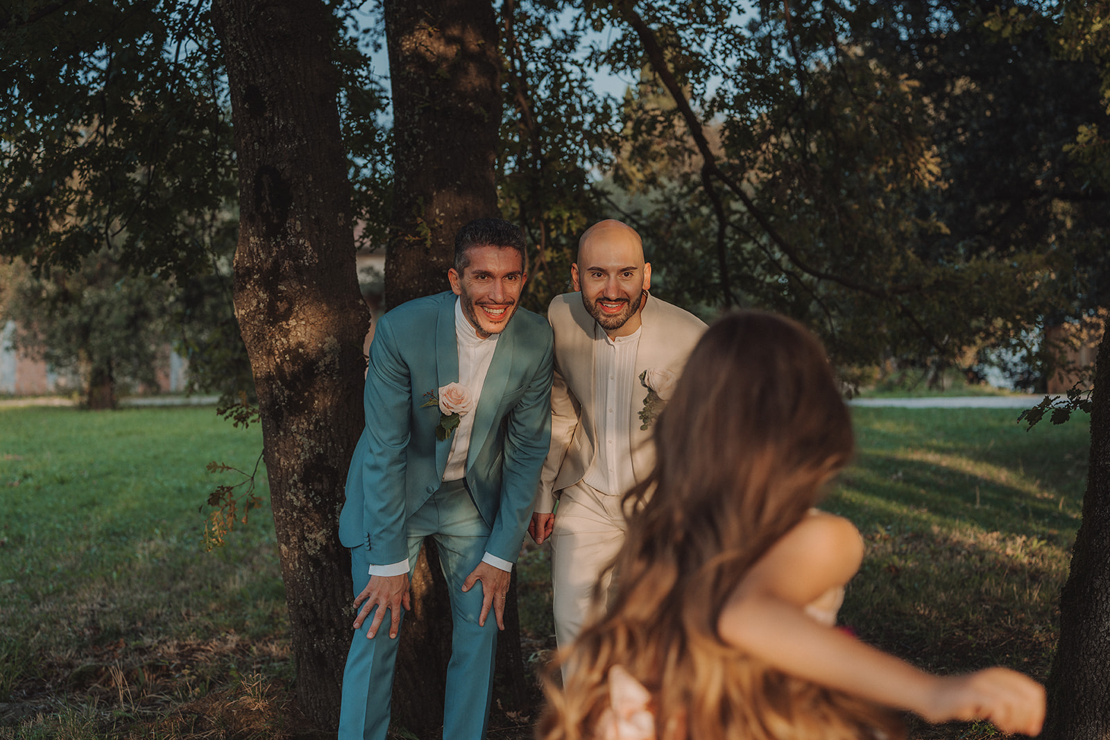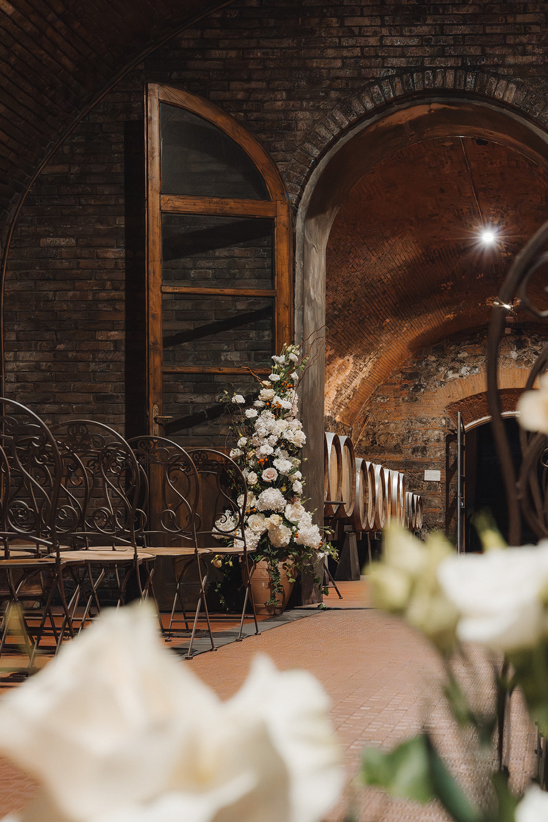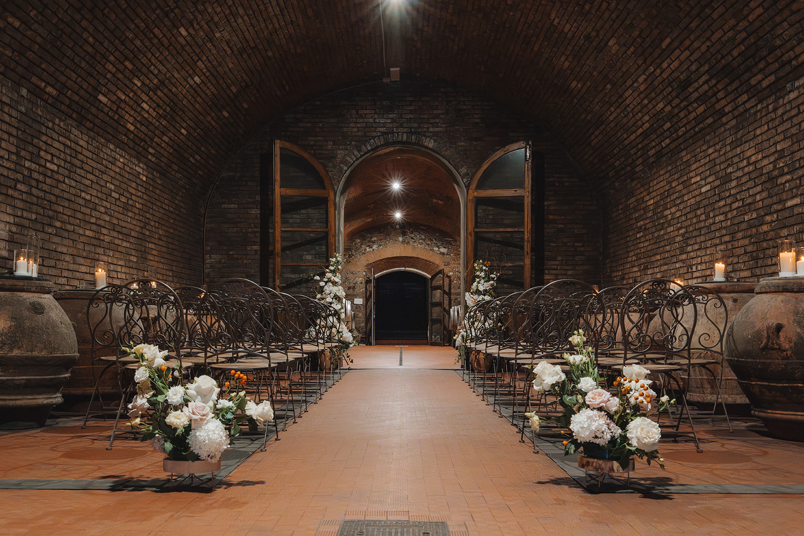 “Mi sei scoppiato dentro al cuore”. Sulle note di Mina, Stefano e Simone sono entrati in cantina come si entra in un posto sacro – con quel misto di tremore e felicità che rende tutto più vero. Intorno, le botti colme di vino, gli amici più cari a fare da coro, e nell’aria quel profumo denso di mosto che non si dimentica: il segnale inequivocabile che stai vivendo qualcosa di autentico, radicato, celebrato con i sensi prima ancora che con le parole.