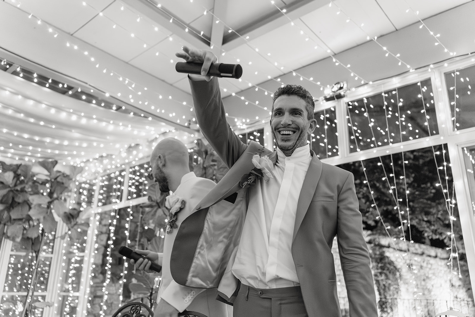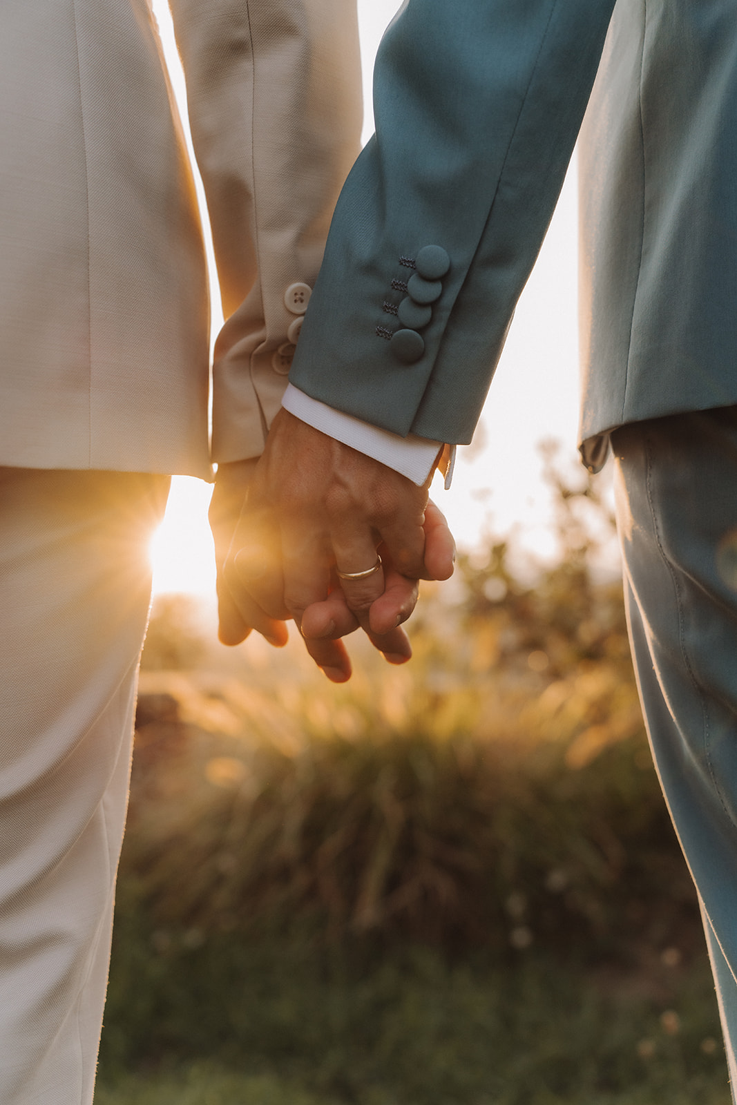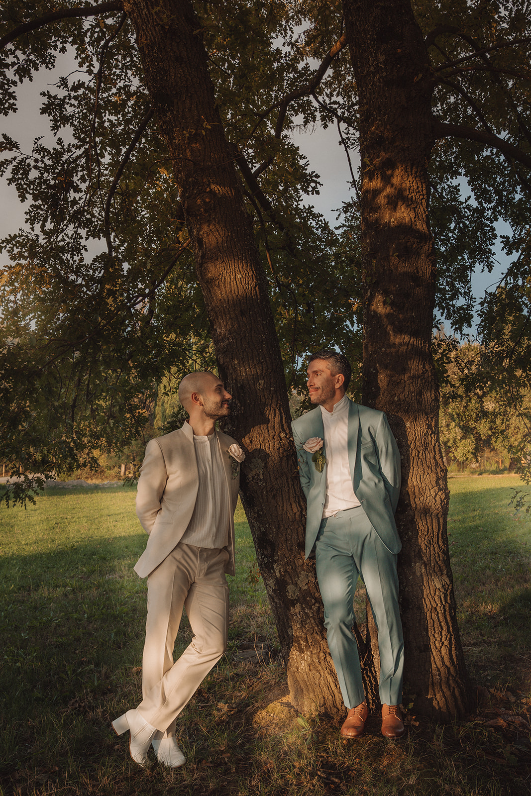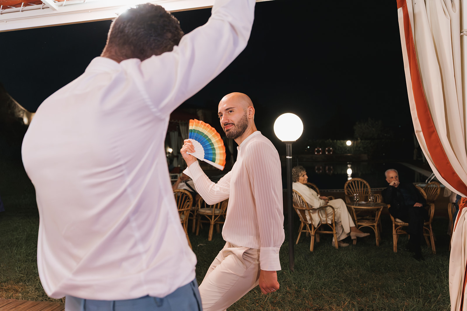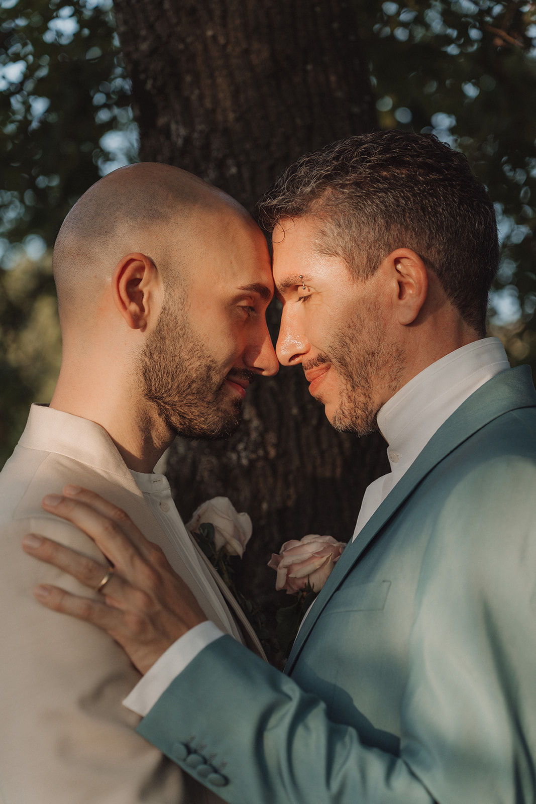 “Mi sei scoppiato dentro al cuore”. Sulle note di Mina, Stefano e Simone sono entrati in cantina come si entra in un posto sacro – con quel misto di tremore e felicità che rende tutto più vero. Intorno, le botti colme di vino, gli amici più cari a fare da coro, e nell’aria quel profumo denso di mosto che non si dimentica: il segnale inequivocabile che stai vivendo qualcosa di autentico, radicato, celebrato con i sensi prima ancora che con le parole.